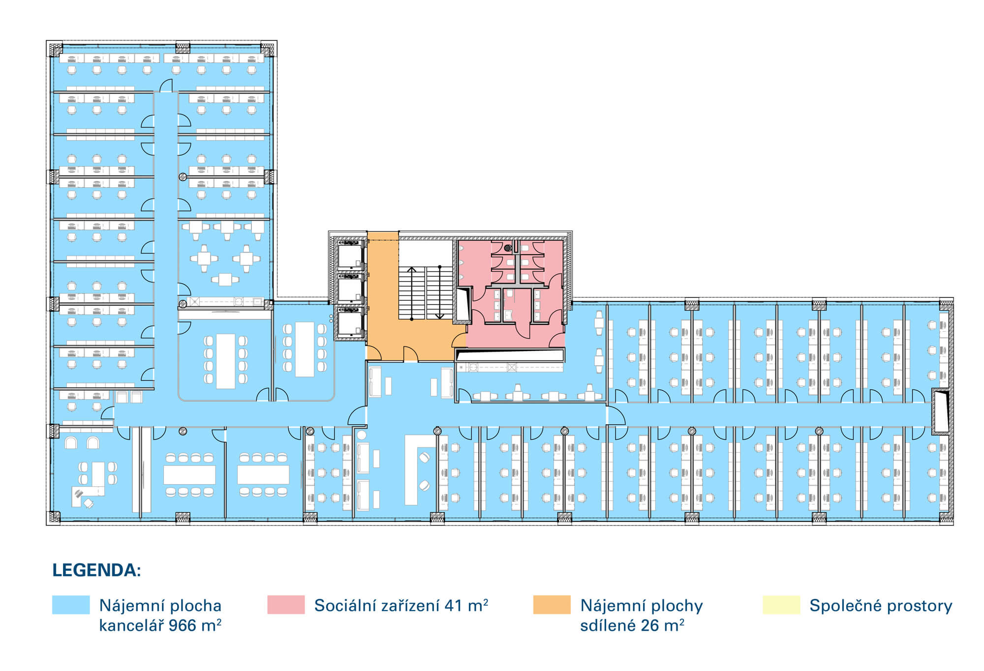 Vzorová dispozice – 1 nájemce – koncept velkoprostorová kancelář